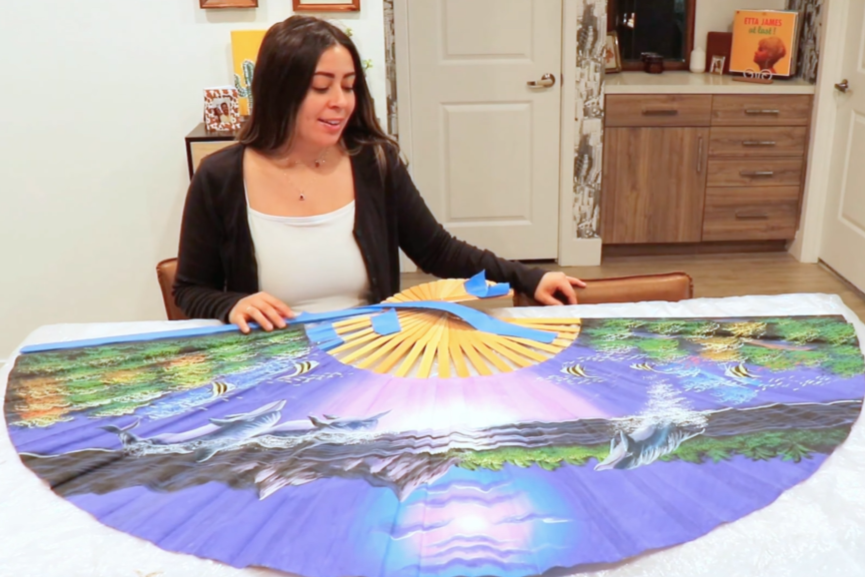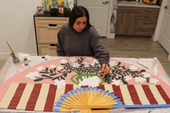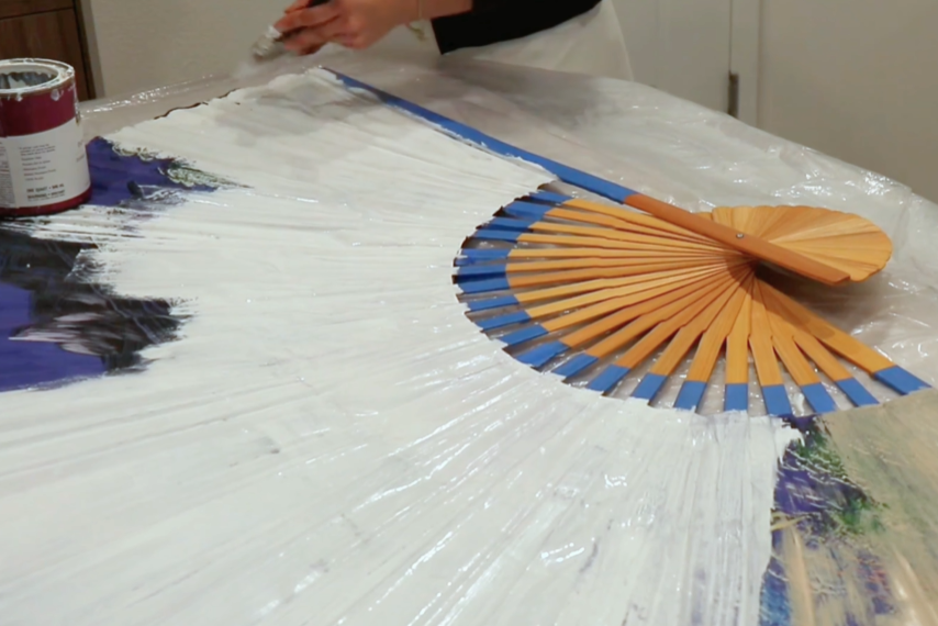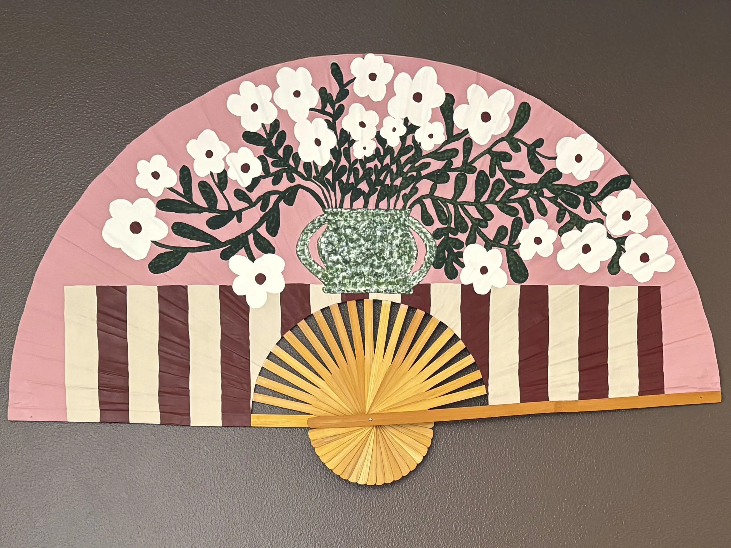 The starting point was unexpected: a four-foot fan I found while thrifting. Its size and structure immediately stood out to me as an opportunity rather than an object, and I decided to reimagine it as a canvas. Projects like this are always my favorite—taking something overlooked and giving it a completely new purpose.