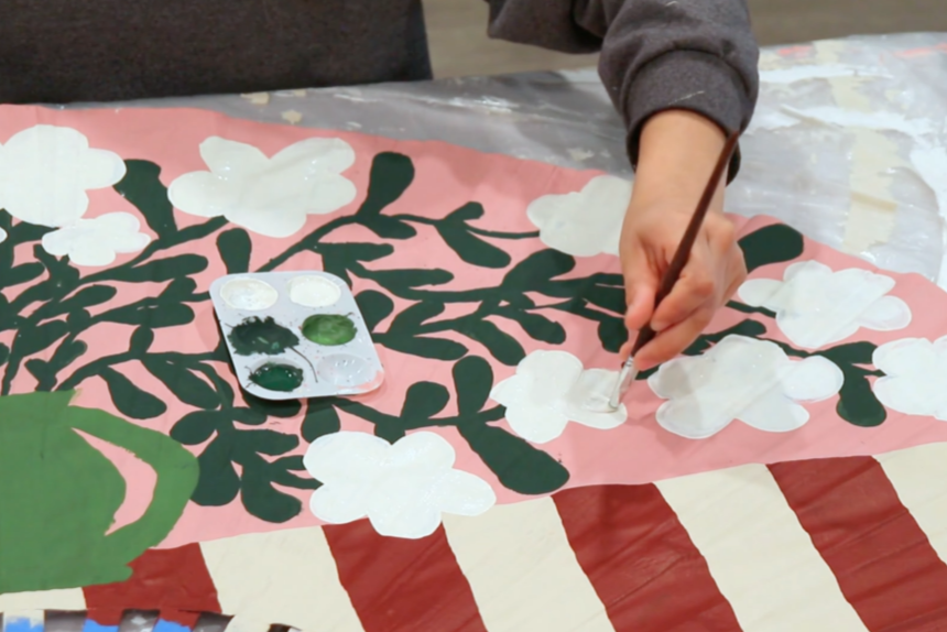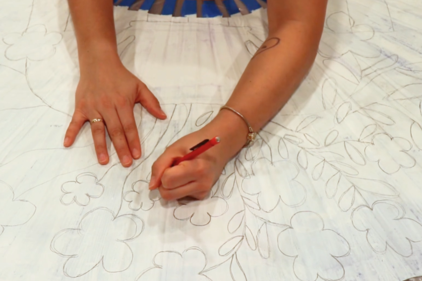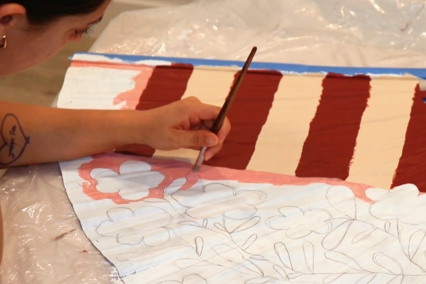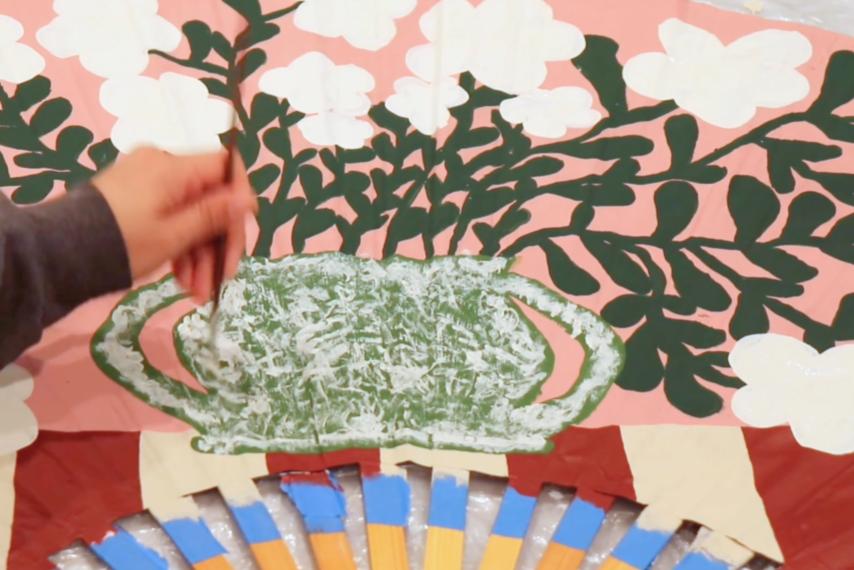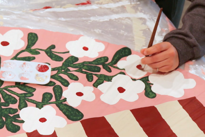 After preparing and priming the surface, I sketched out a composition that would feel both classic and expressive. The final design features a floral arrangement in a vase, set on a table with a striped tablecloth. The combination of organic shapes and structured pattern creates a balance of movement and contrast, while the scale of the piece allows it to function as a true focal point in the room.